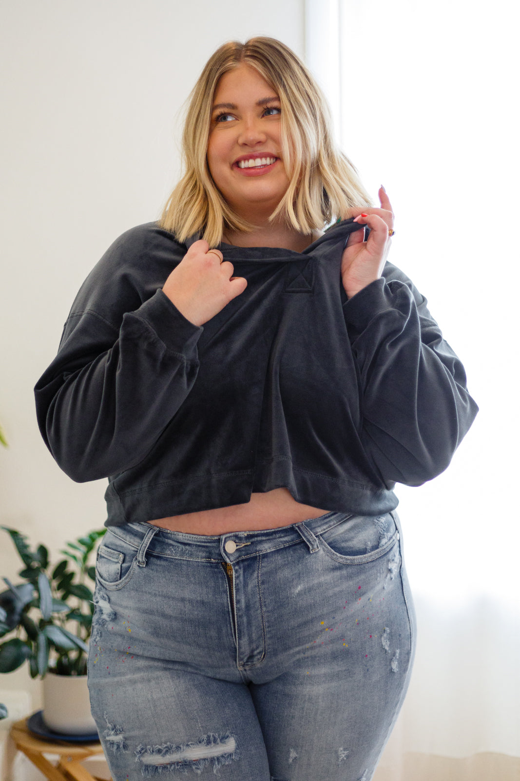 Are you looking for a comfortable, but stylish option that isn't blah? Well then cozy up in the Velvet Icon Hoodie! A stunning velvet fabric makes up this plush hoodie with a v-neckline and slightly cropped, boxy silhouette. Wear this to your next movie night or throw over your workout set for an on the go athleisure look. This is an all-in one style we know you will LOVE.