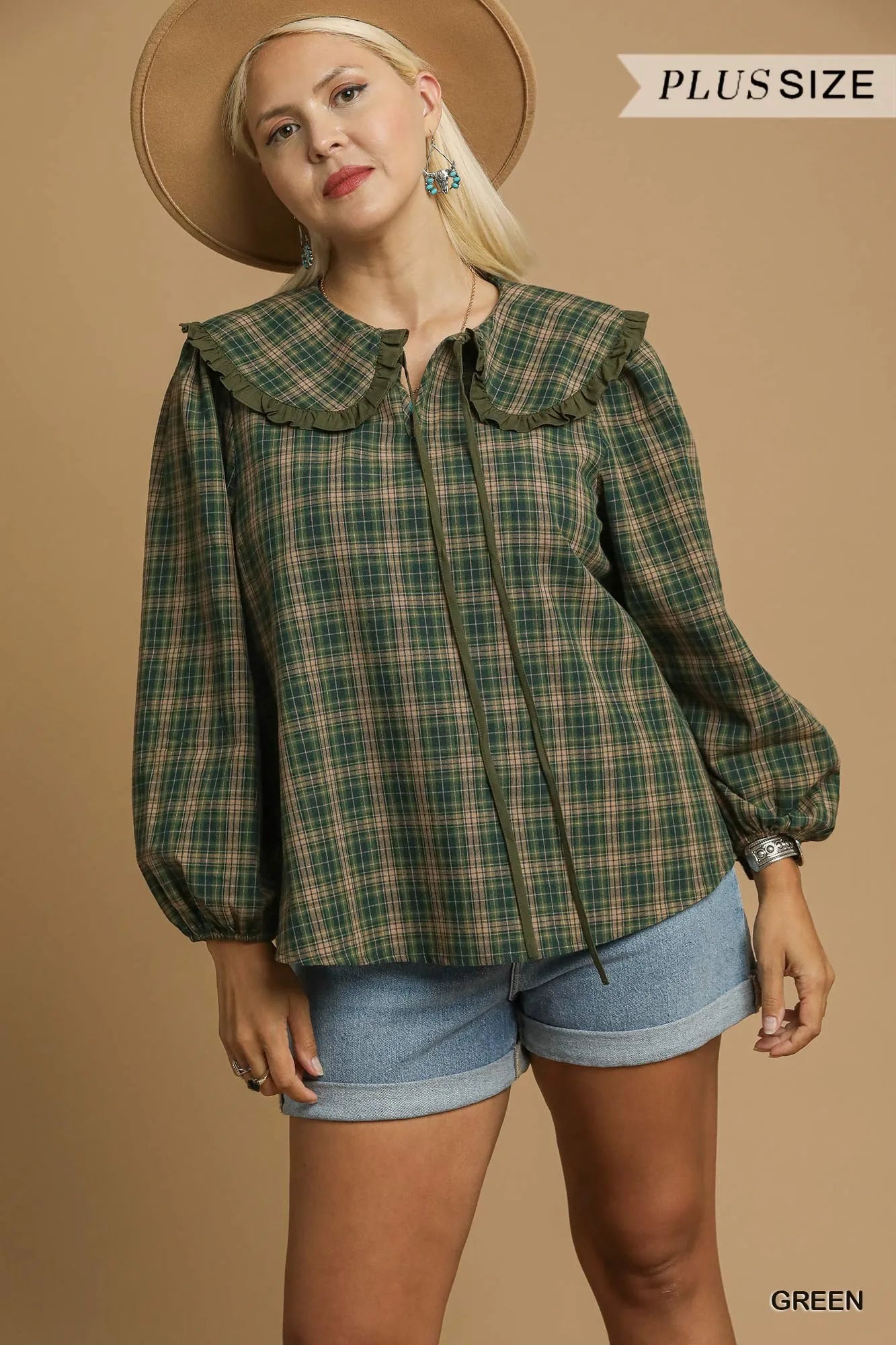 Umgee Full Size Plaid Ruffle Collar Blouse Plus Size