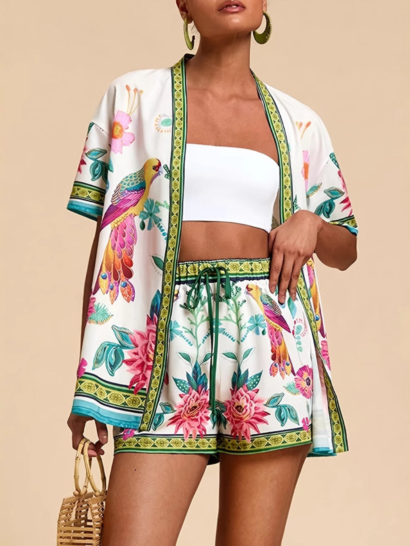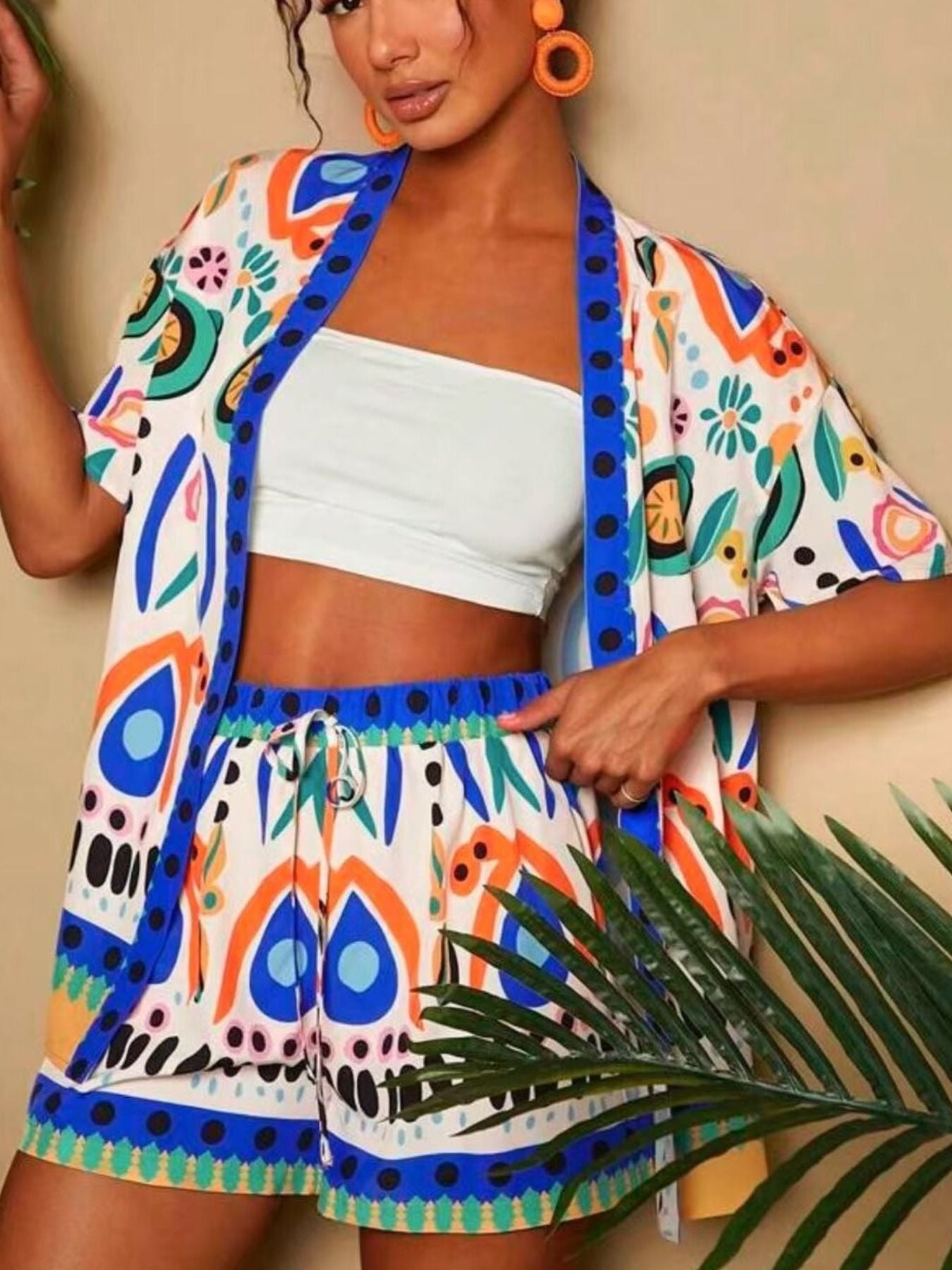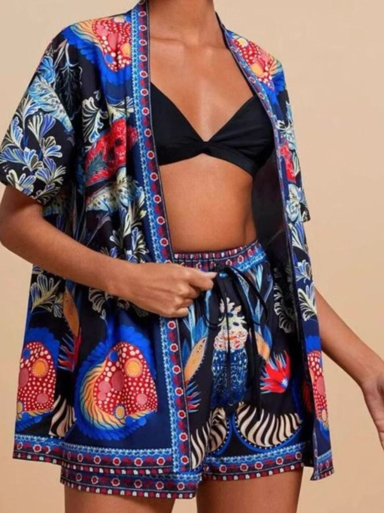 Printed Open Front Cardigan and Shorts Set