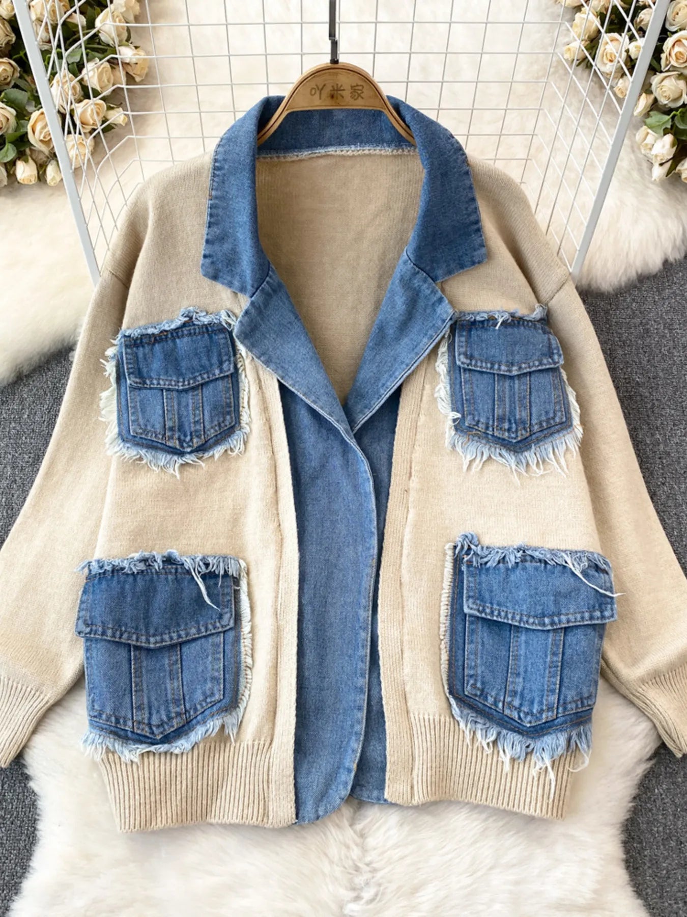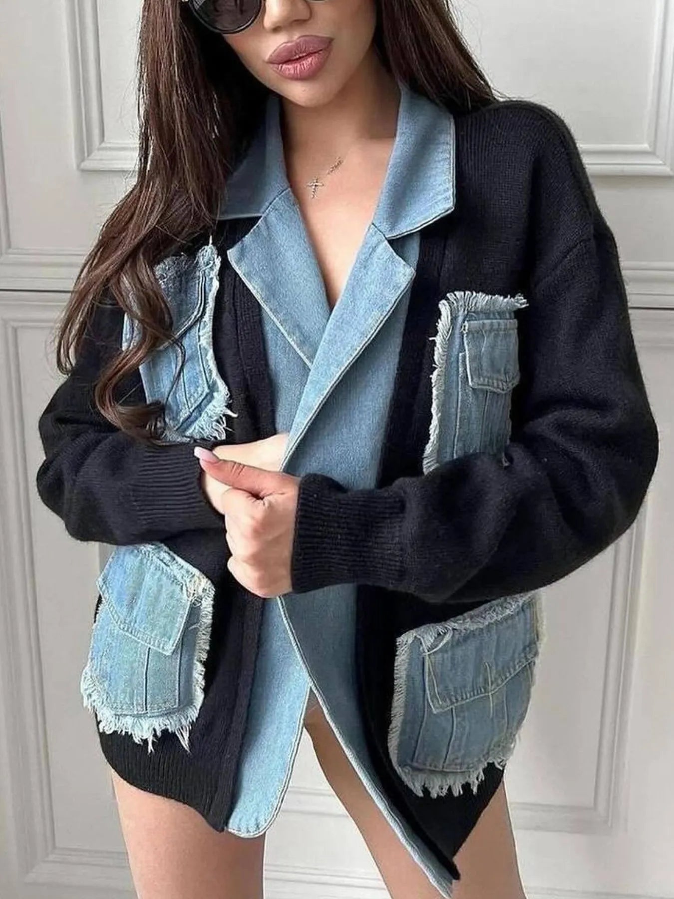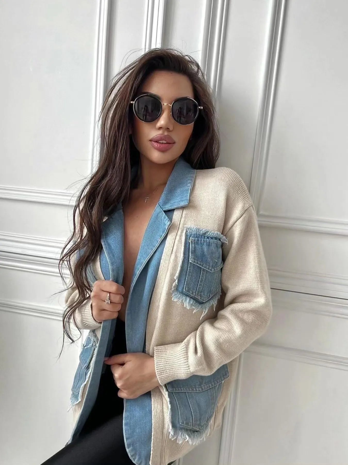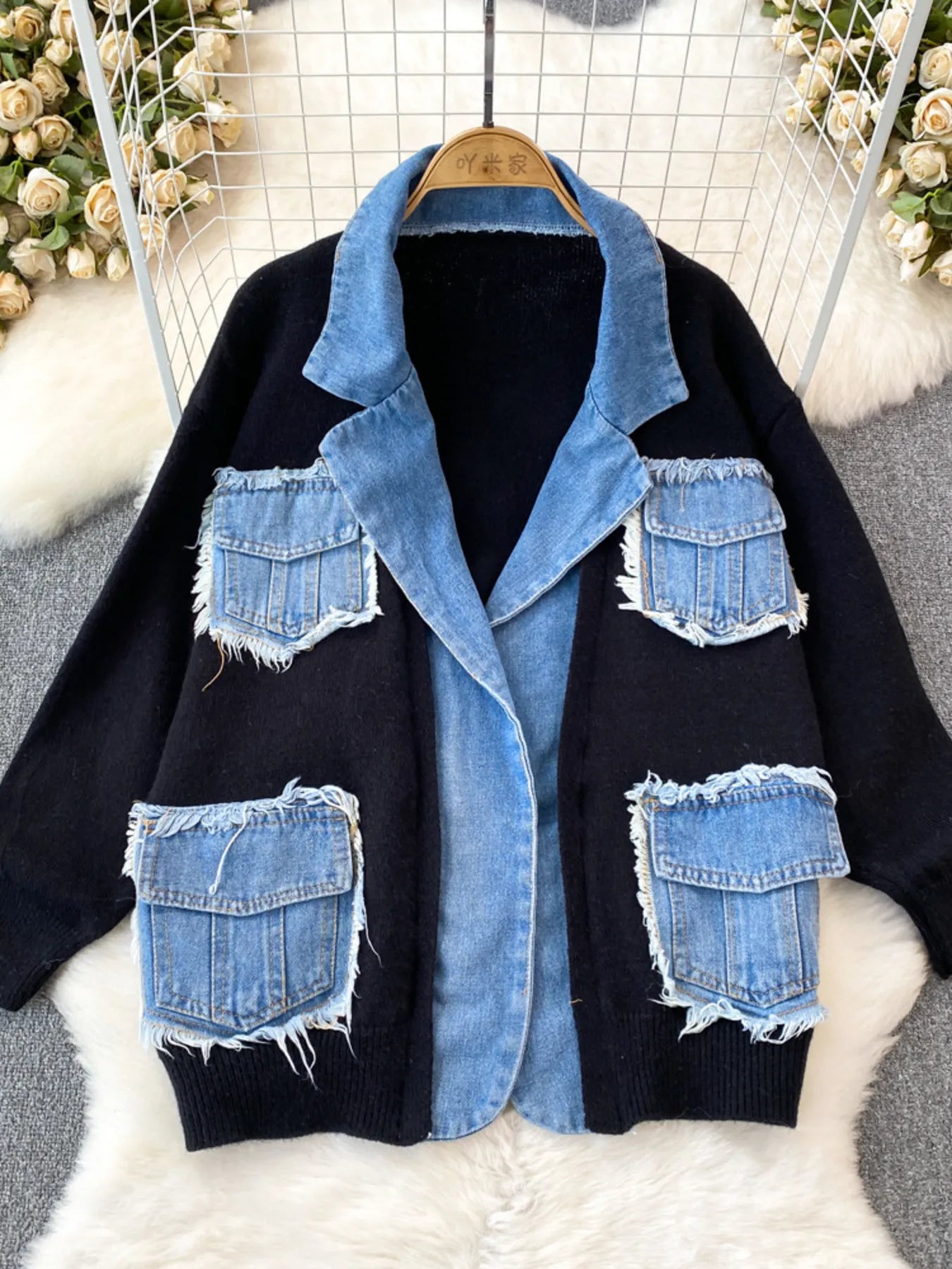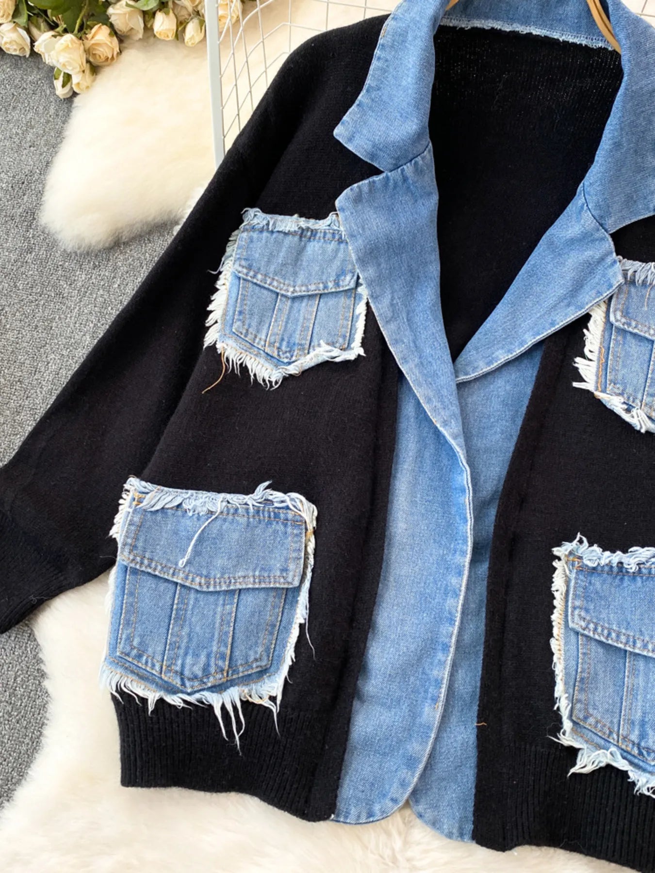 - Features:Contrast Stitching,Pocketed,Raw Hem