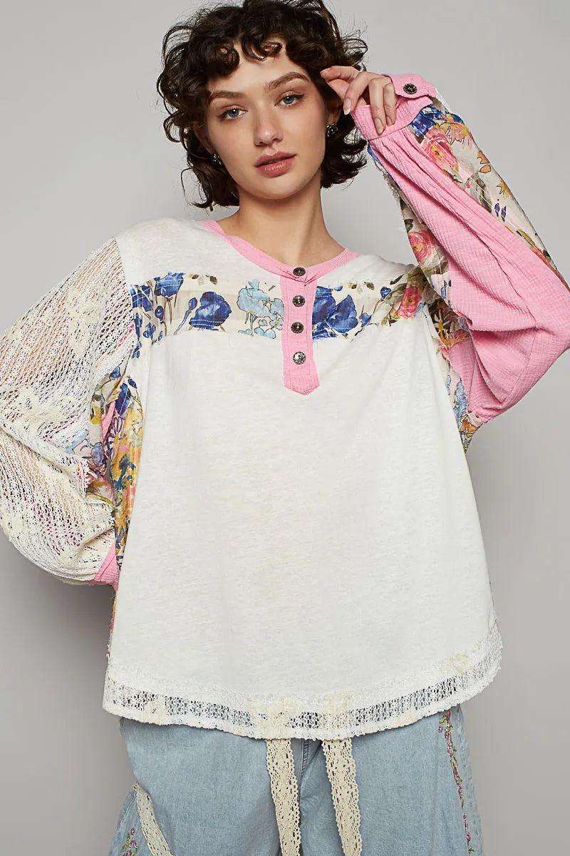 This charming floral print blouse features a unique design combining a cream-colored body with vibrant pink raglan sleeves adorned with colorful floral patterns. The garment showcases delicate lace trim along the hemline, adding a feminine touch to the overall design. Made from comfortable cotton blend fabric, this blouse offers a relaxed fit perfect for casual wear. The button front closure and mixed pattern aesthetic create a vintage-inspired bohemian style that's both fashion and timeless. The long sleeves provide coverage while the floral print adds a pop of color and whimsical charm to any outfit.