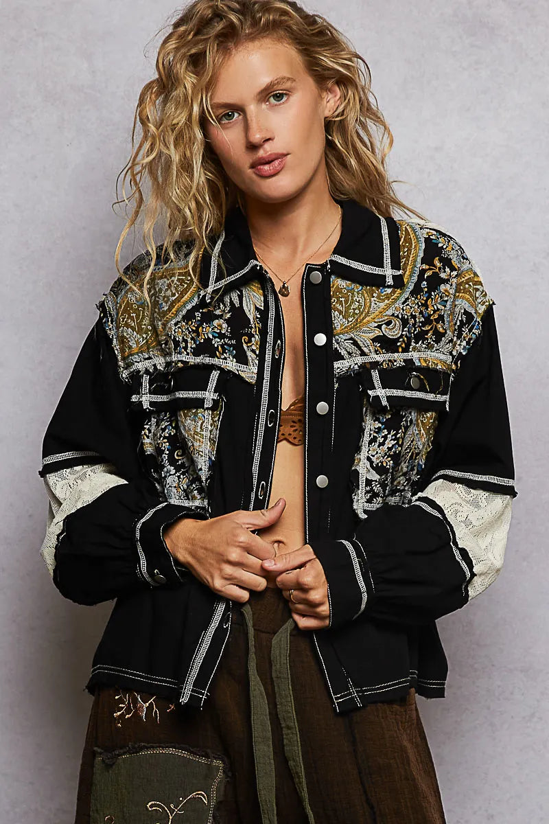 This stunning vintage-inspired denim jacket features intricate baroque embroidery that transforms a classic silhouette into a statement piece. Crafted from premium cotton denim with artistic embellishments in metallic threads, this jacket combines street style with luxury fashion elements. The oversized fit offers comfortable layering options while the detailed embroidery on the chest, collar, and sleeves creates visual interest. Perfect for adding an edgy yet sophisticated touch to any outfit, this jacket showcases excellent craftsmanship with its contrast stitching, functional button closure, and dual chest pockets. The vintage wash and distressed details give it an authentic lived-in feel that pairs effortlessly with both casual and elevated looks.