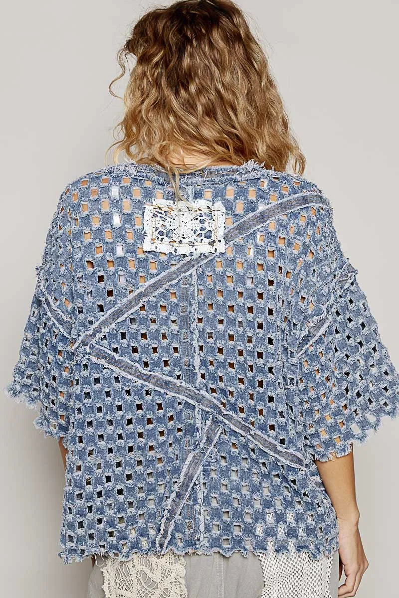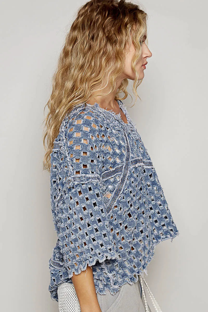 This fashion denim top features a distinctive crochet-style weave construction with an open, breathable design perfect for casual wear. Made from high-quality denim material with distressed finishing, it offers a relaxed oversized fit with three-quarter sleeves and cropped length. The unique perforated pattern adds bohemian flair while maintaining durability. Ideal for layering or wearing alone, this versatile piece combines comfort with contemporary street style, making it perfect for casual outings, festivals, or everyday wear.