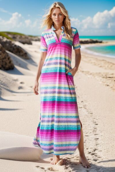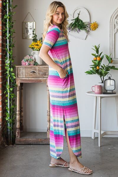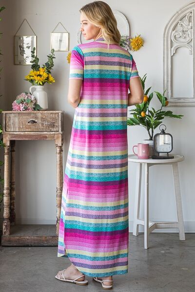 The Striped Short Sleeve Maxi Tee Dress is a versatile and comfortable option for your wardrobe. The striped pattern adds a timeless touch to the dress, while the maxi length lends a relaxed and effortless vibe. This tee dress is perfect for a casual day out or can be dressed up with sandals or sneakers for a chic and easy-going look.