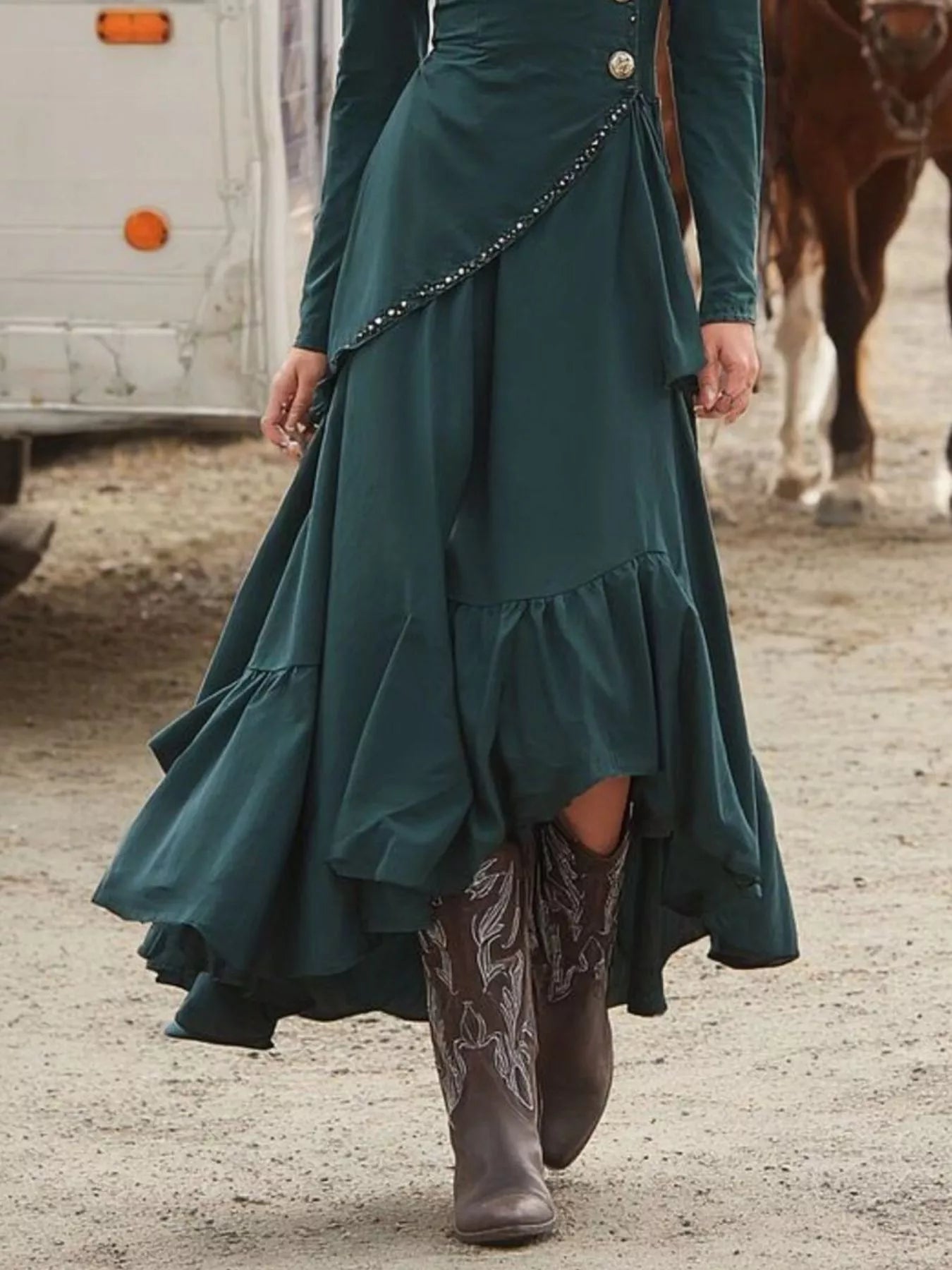 - Features:Buttoned,Asymmetrical,Ruffled