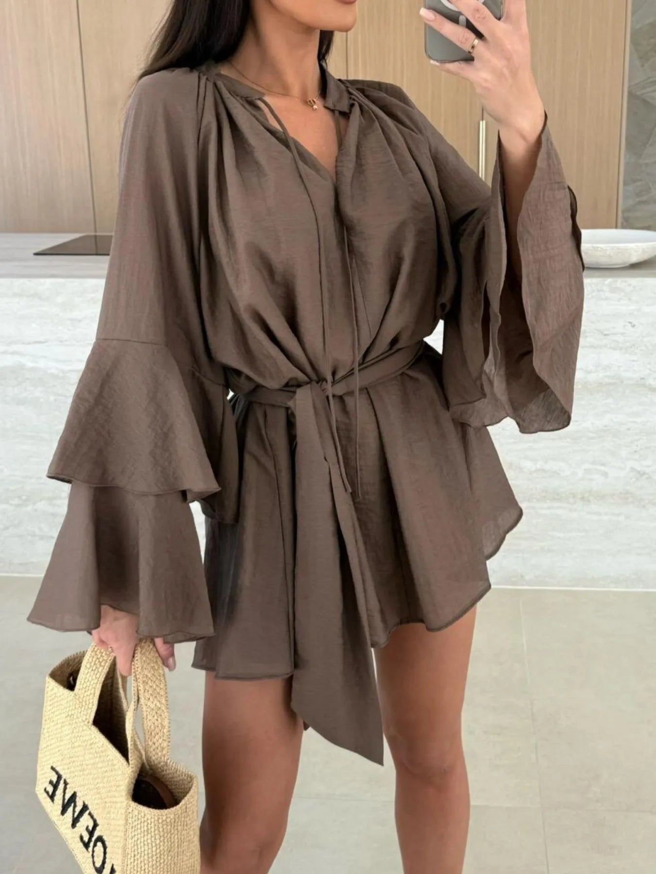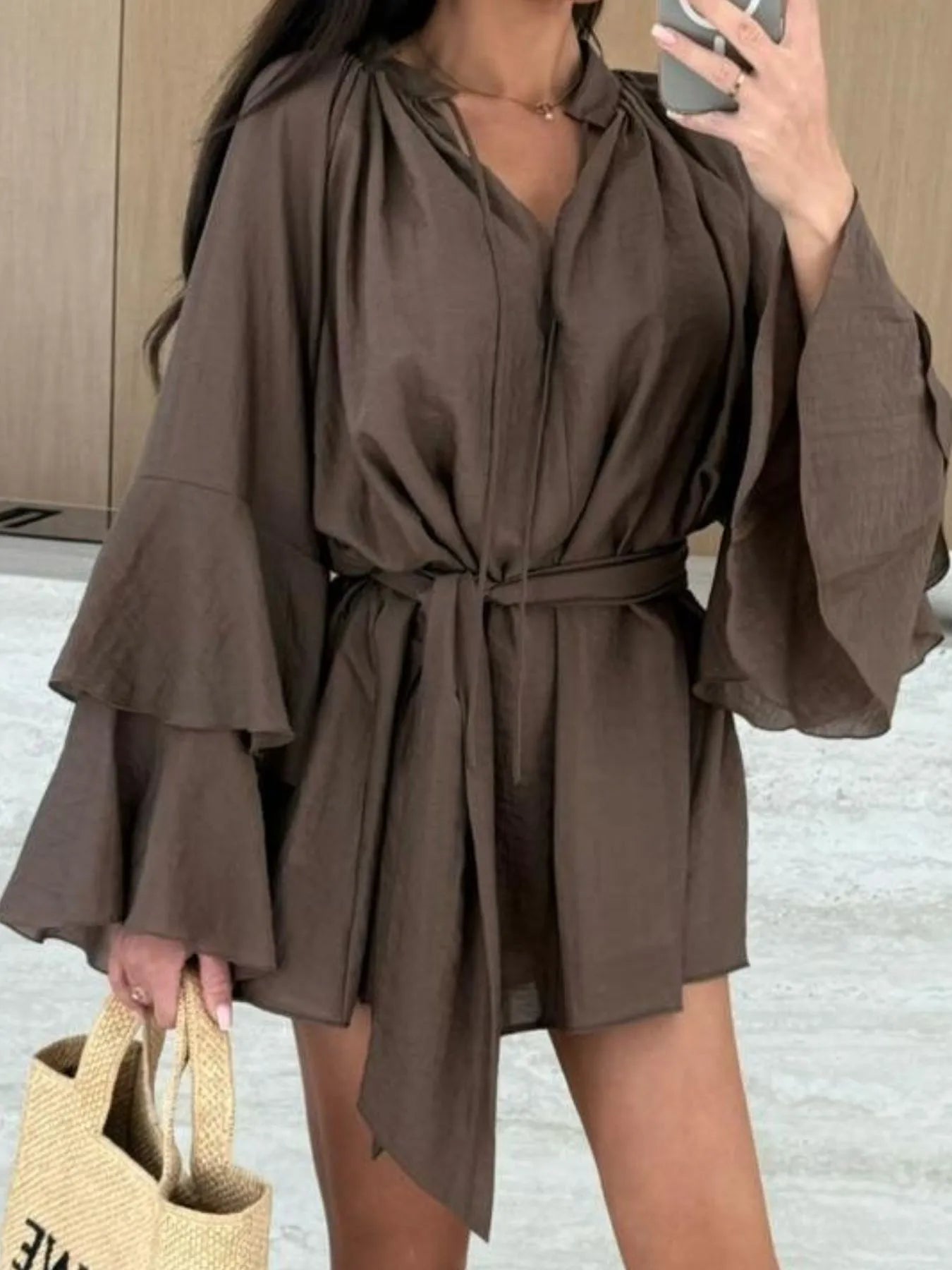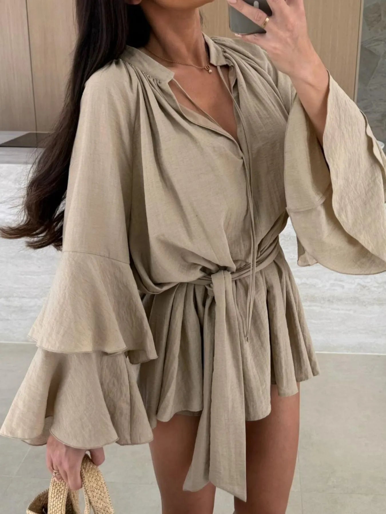 - Features:Tied,Tiered,Ruffled