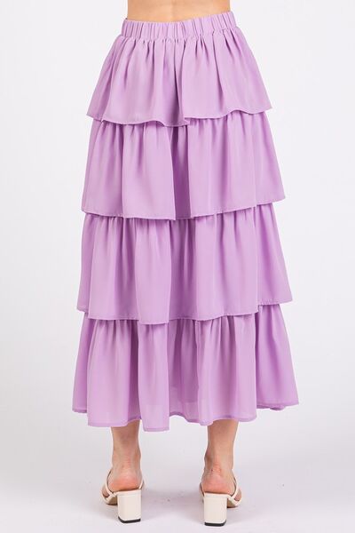 The Chiffon Ruffle Layer Elastic Waist Midi Skirt is a beautiful and graceful addition to your wardrobe. It features cascading ruffle tiers that create a flowy and elegant silhouette. The elastic waistband offers a comfortable and adjustable fit for all-day wear. Perfect for both casual and dressy occasions, this midi skirt is versatile and easy to style. Pair it with a simple top and sandals for a casual look, or dress it up with heels and statement jewelry for a more formal outfit.