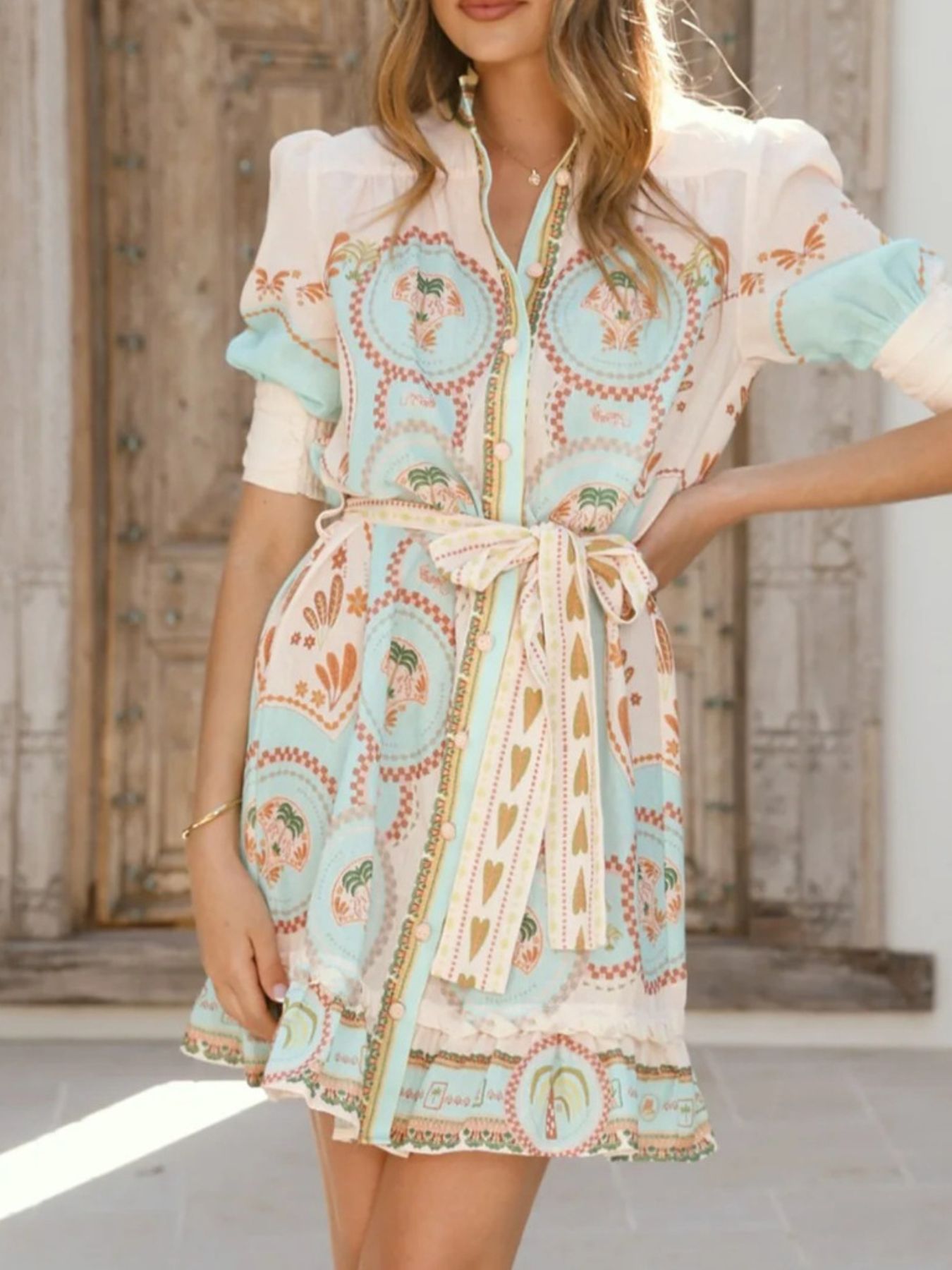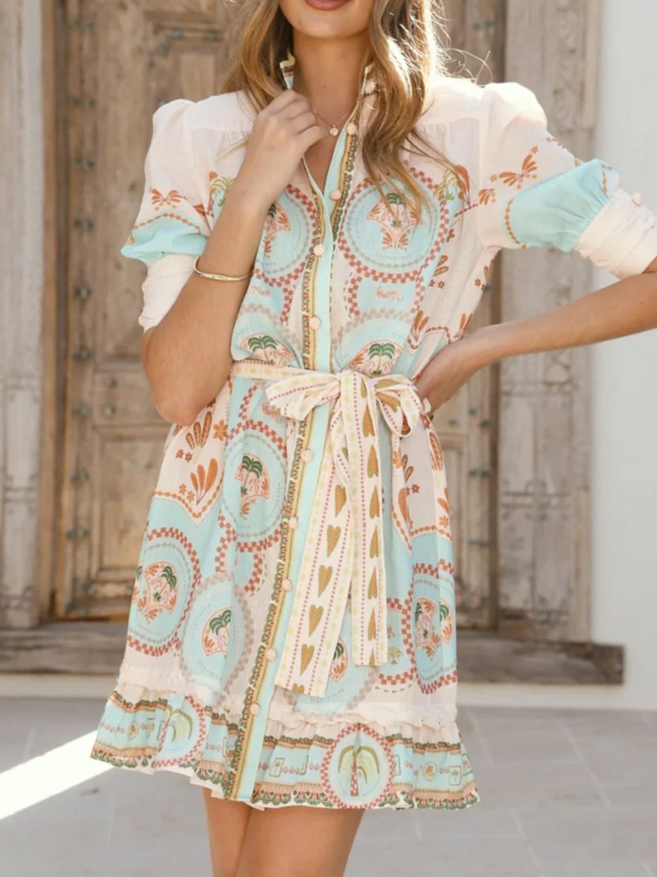 - Features:Buttoned,Ruffled,Tied