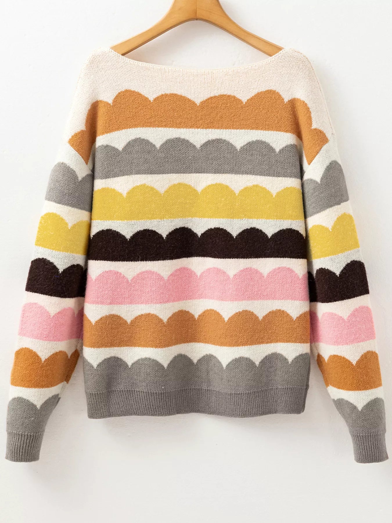 Wave Striped Balloon Sleeve Drop Shoulder Sweater