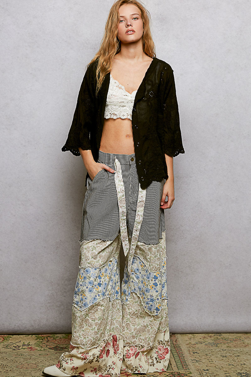 This short sleeve shirt is designed with a flattering V-neck and relaxed fit for a comfortable wear. Crafted in crochet fabric, it offers a bohemian touch to the look. The button closure adds a classic and timeless detail. Featuring scalloped opening detail and vintage washing, this shirt exudes a unique and vintage-inspired style. Available in a solid color, this versatile piece can be easily paired with different bottoms for a chic and effortless outfit.