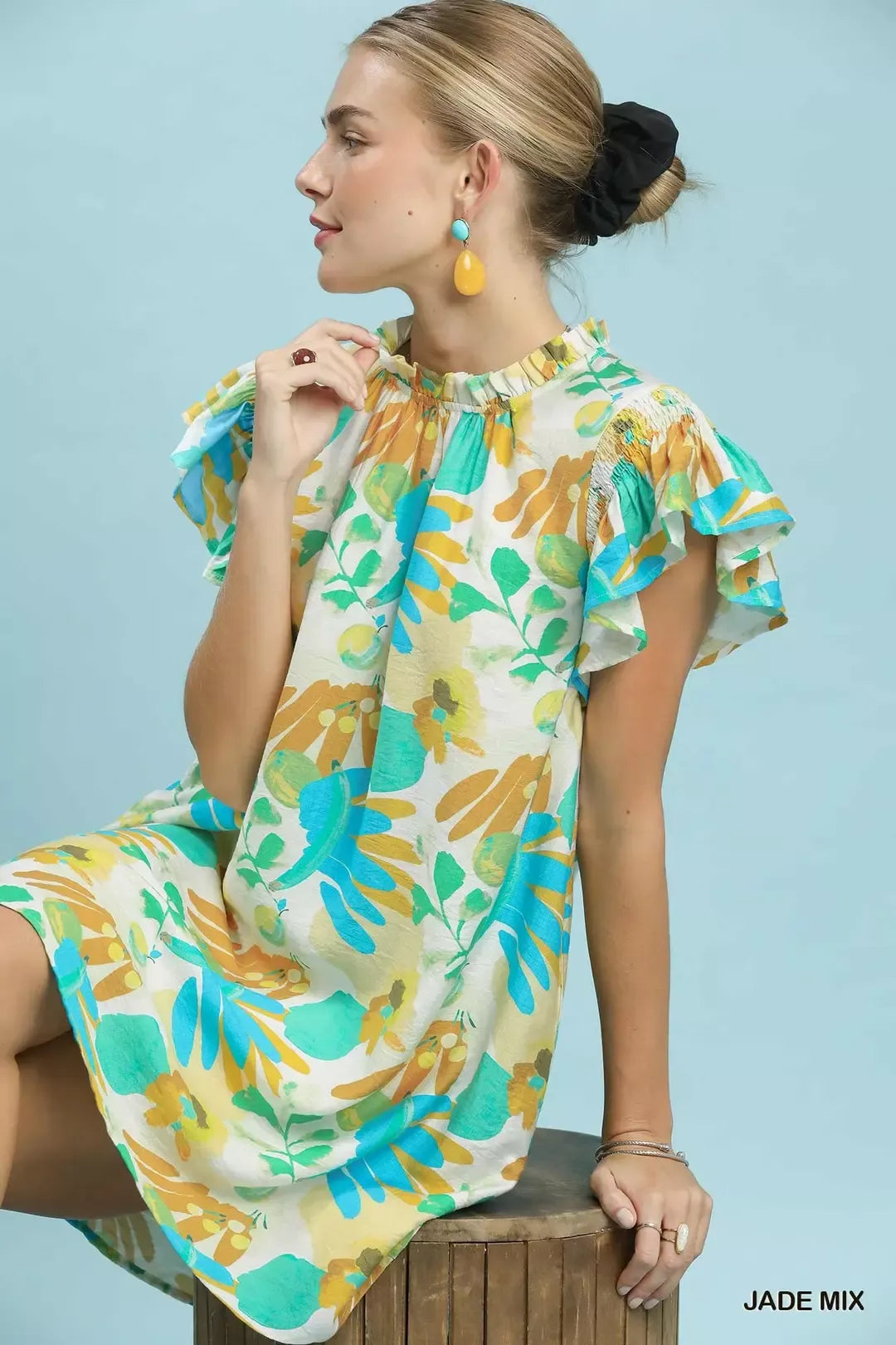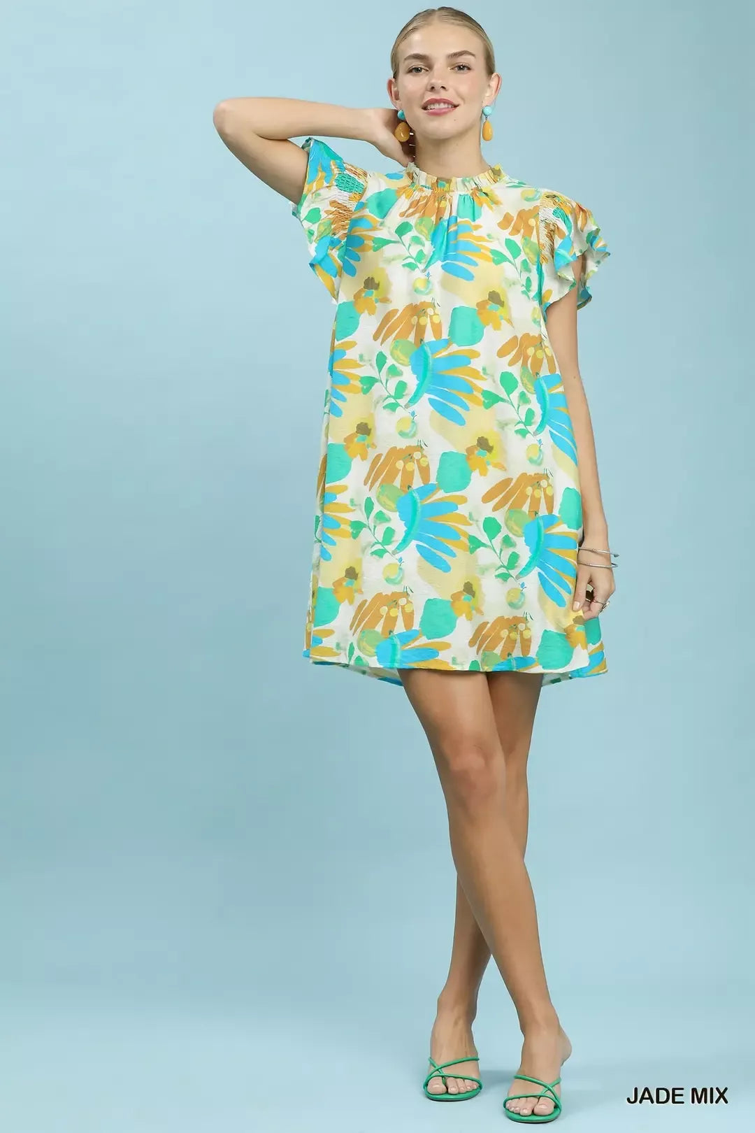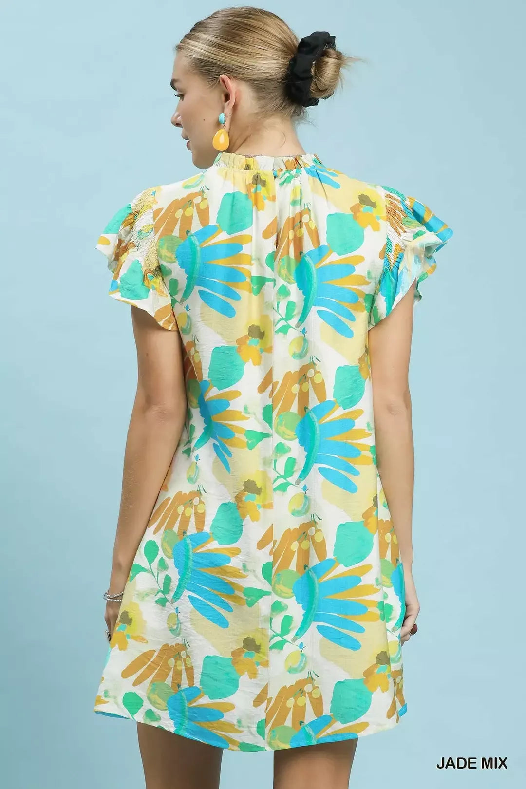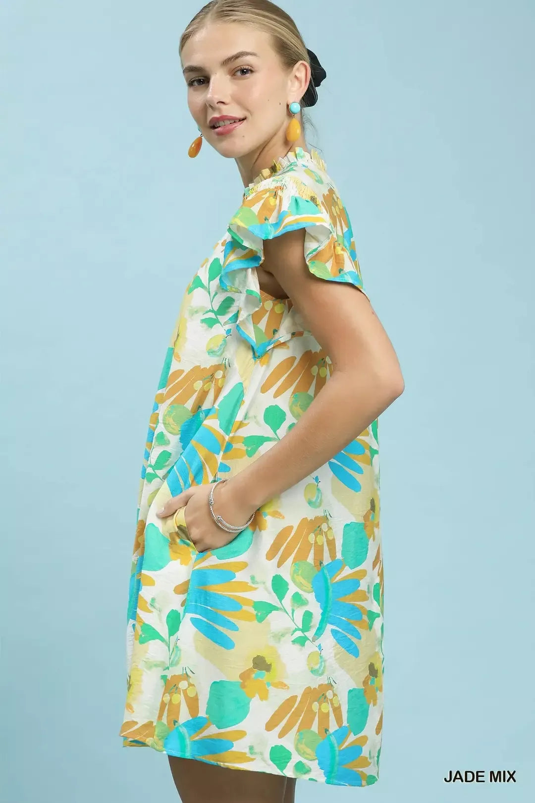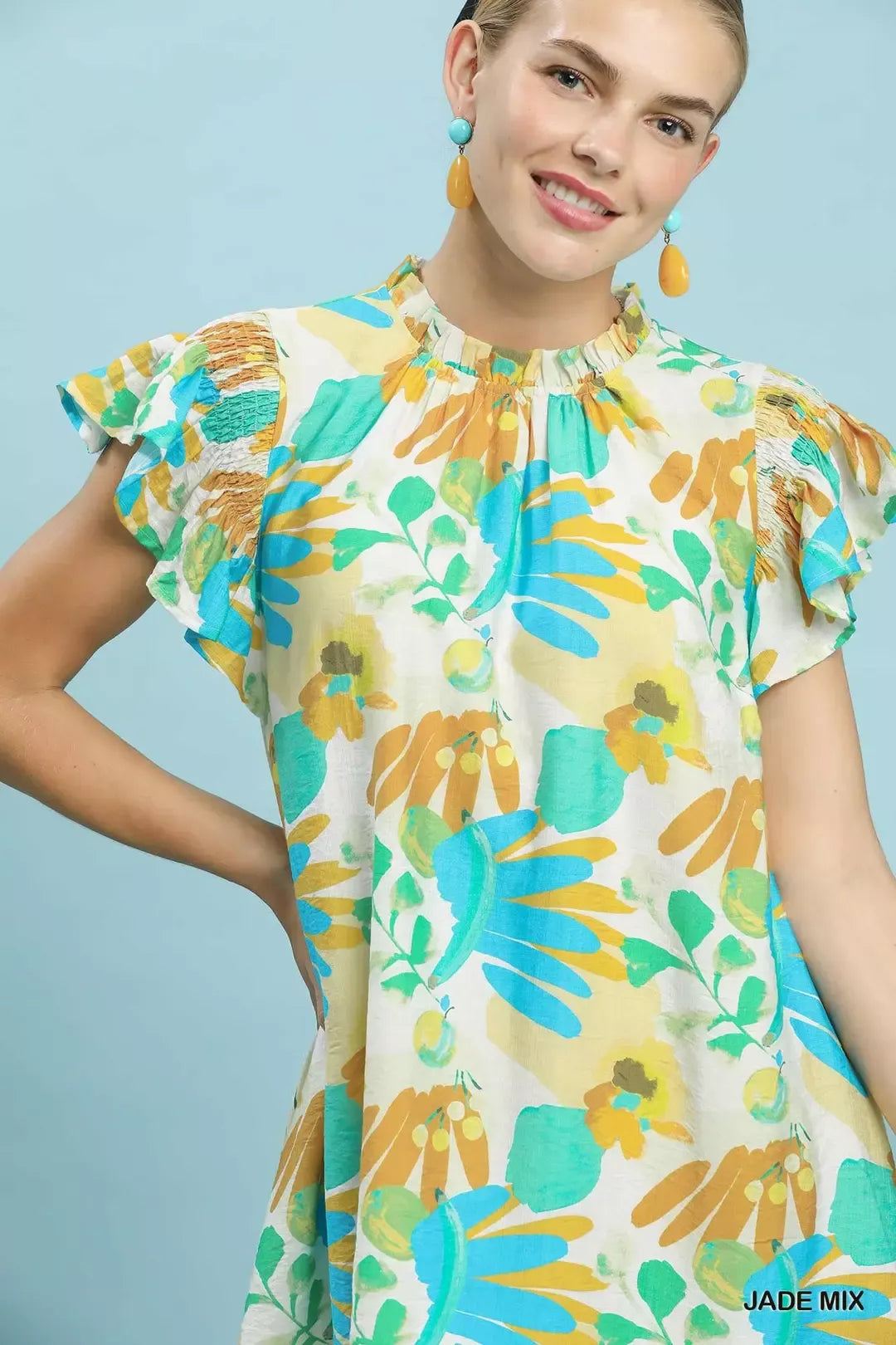 This charming mini dress features a fresh botanical print that brings a lively, natural touch to your wardrobe. Adorned with delicate ruffle details for a soft, romantic look, it offers a flattering, flowy fit that moves gracefully with you. Lightweight and feminine, it’s perfect for daytime outings, weekend brunches, vacations, and any casual occasion where you want to look effortlessly sweet and stylish.