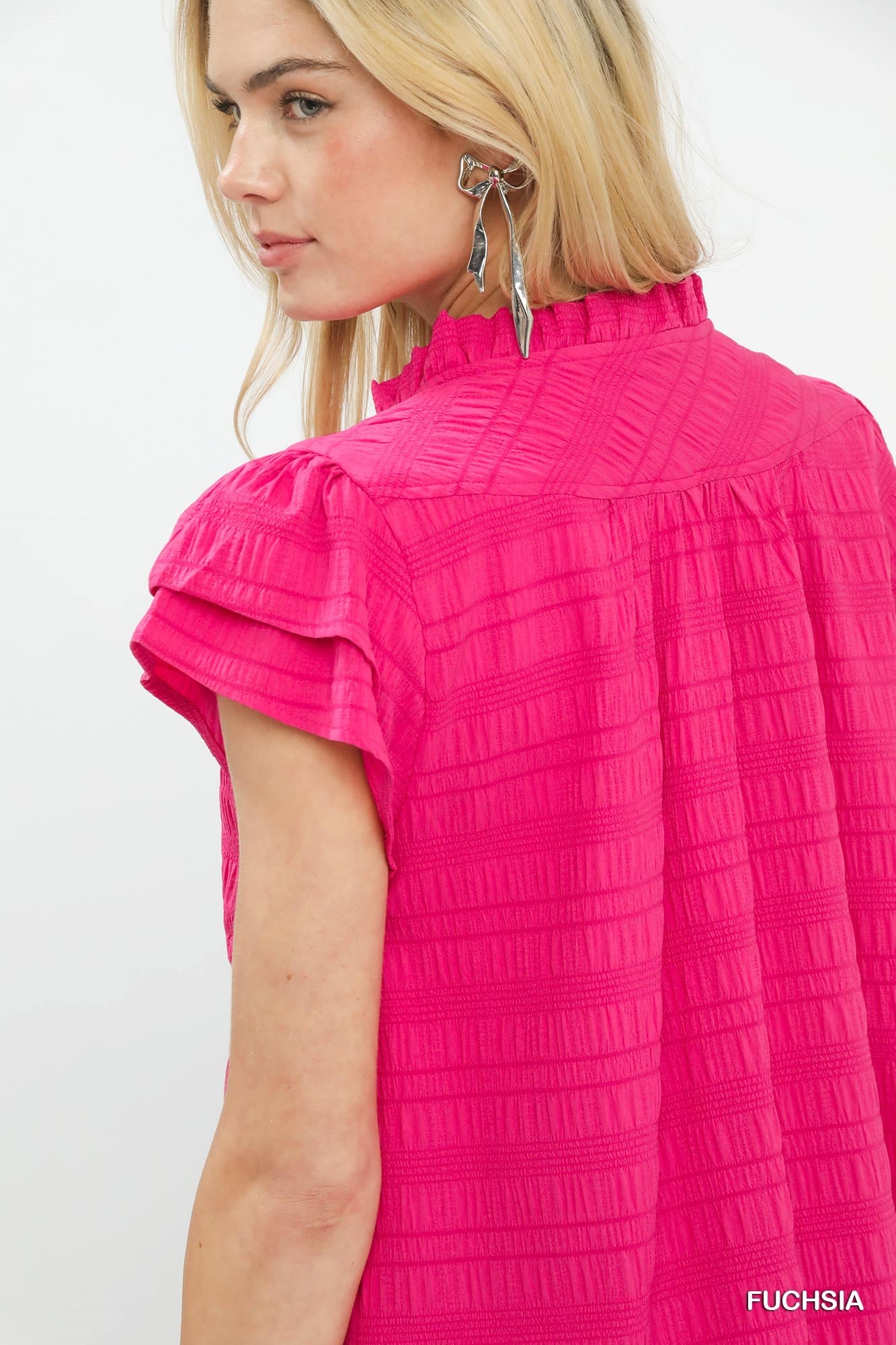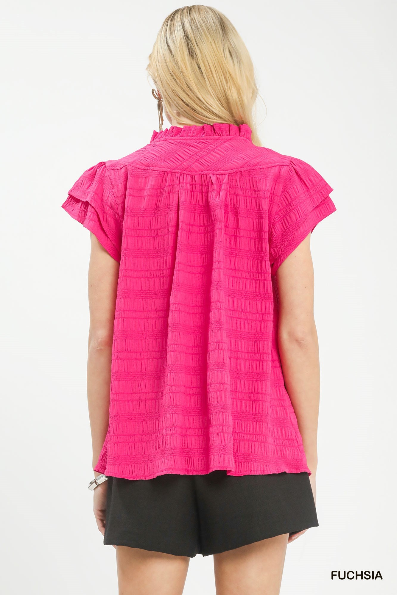 This Textured Flutter Sleeve Split Neck Top is crafted from lightweight, textured fabric that offers a subtle, elevated look and all-day comfort. It features a graceful split neck design that flatters the neckline, paired with flowy flutter sleeves for a soft, feminine touch. The gentle texture adds dimension without being overwhelming, while the relaxed fit ensures easy, effortless wear. Perfect for everyday outings, vacations, or casual occasions, it pairs beautifully with jeans, shorts, or skirts for a polished, airy look.