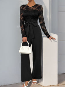 Perfee Lace Round Neck Long Sleeve Jumpsuit