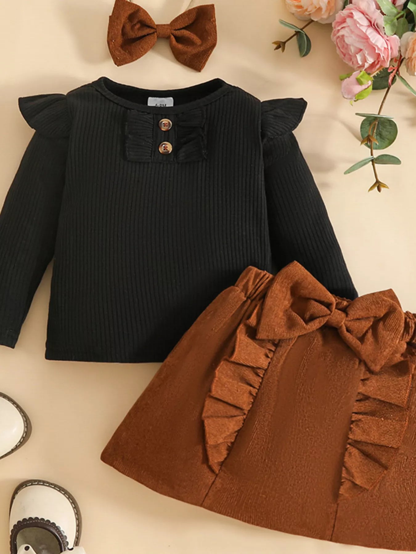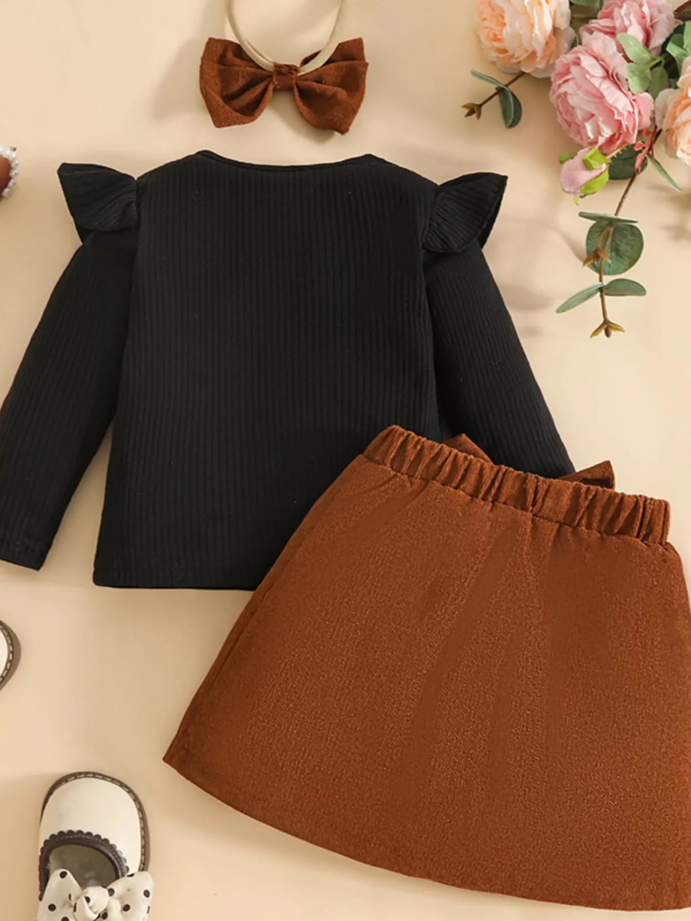 Children's Ribbed Knit Top and Bowknot Skirt Set with Headband