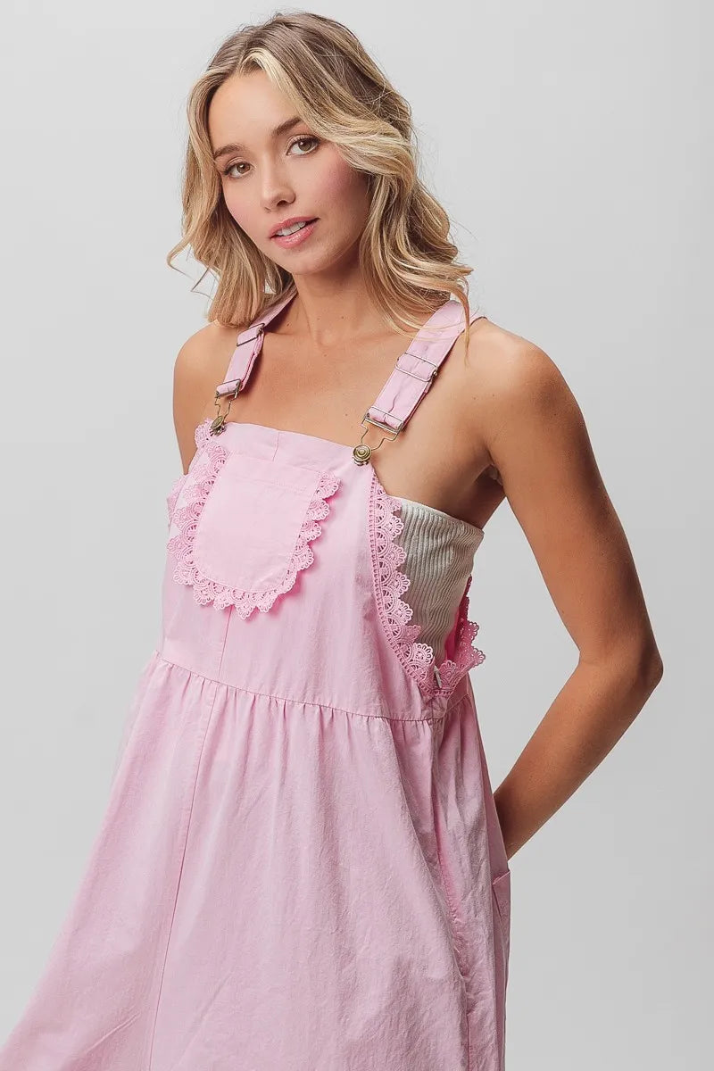 A lace edge detail wide leg overall is a stylish and feminine garment that combines the casual silhouette of overalls with delicate lace trim on the edges. The wide-leg design offers a chic and modern look, providing comfort and movement. The lace edge detailing adds a touch of elegance and sophistication to the overalls, elevating them from a casual to a more dressed-up style. This piece can be versatile and worn for various occasions, depending on how it's styled. Overall, a lace edge detail wide leg overall is a fashionable and unique choice that blends comfort with a feminine touch for a stylish outfit.
