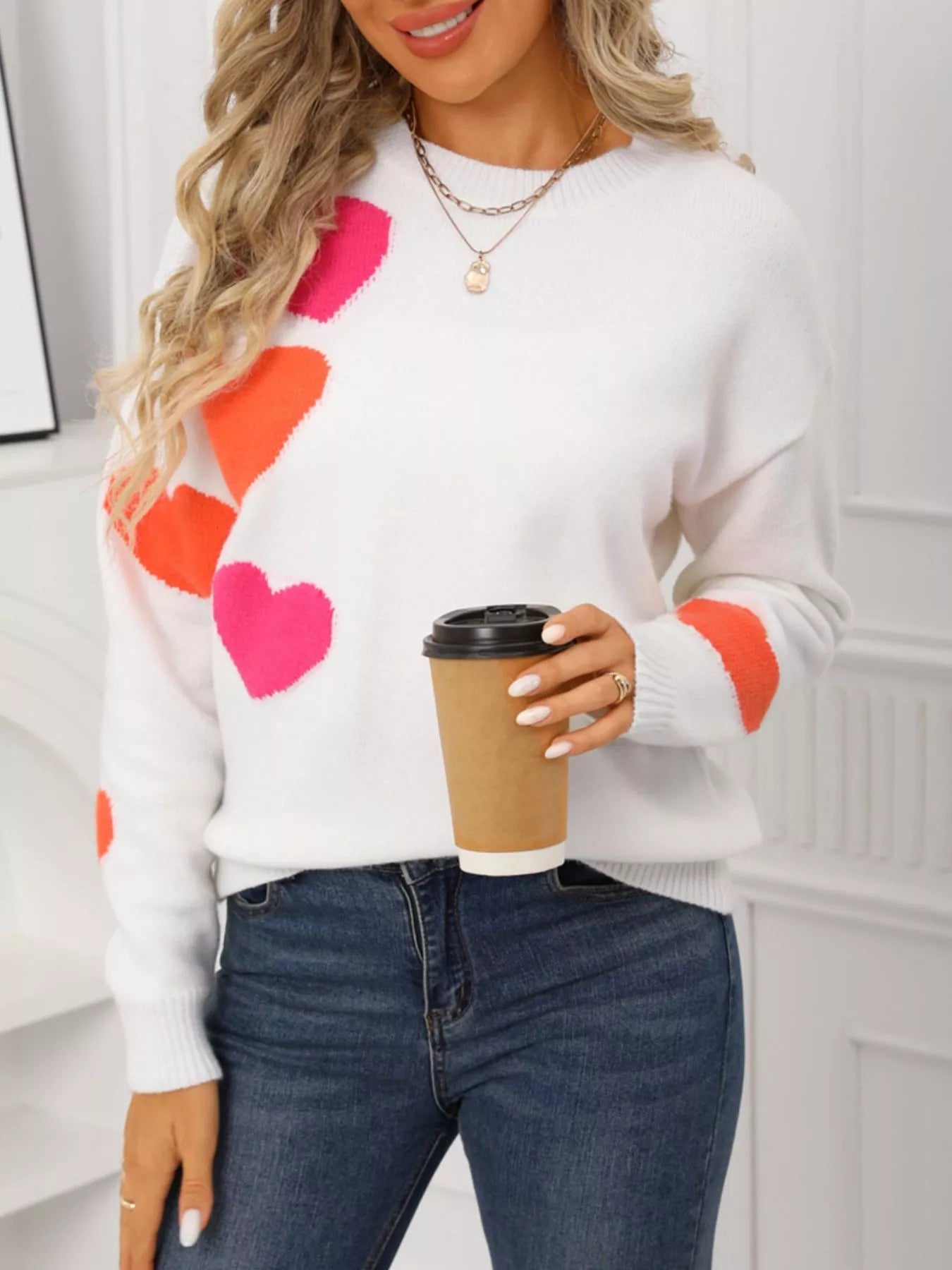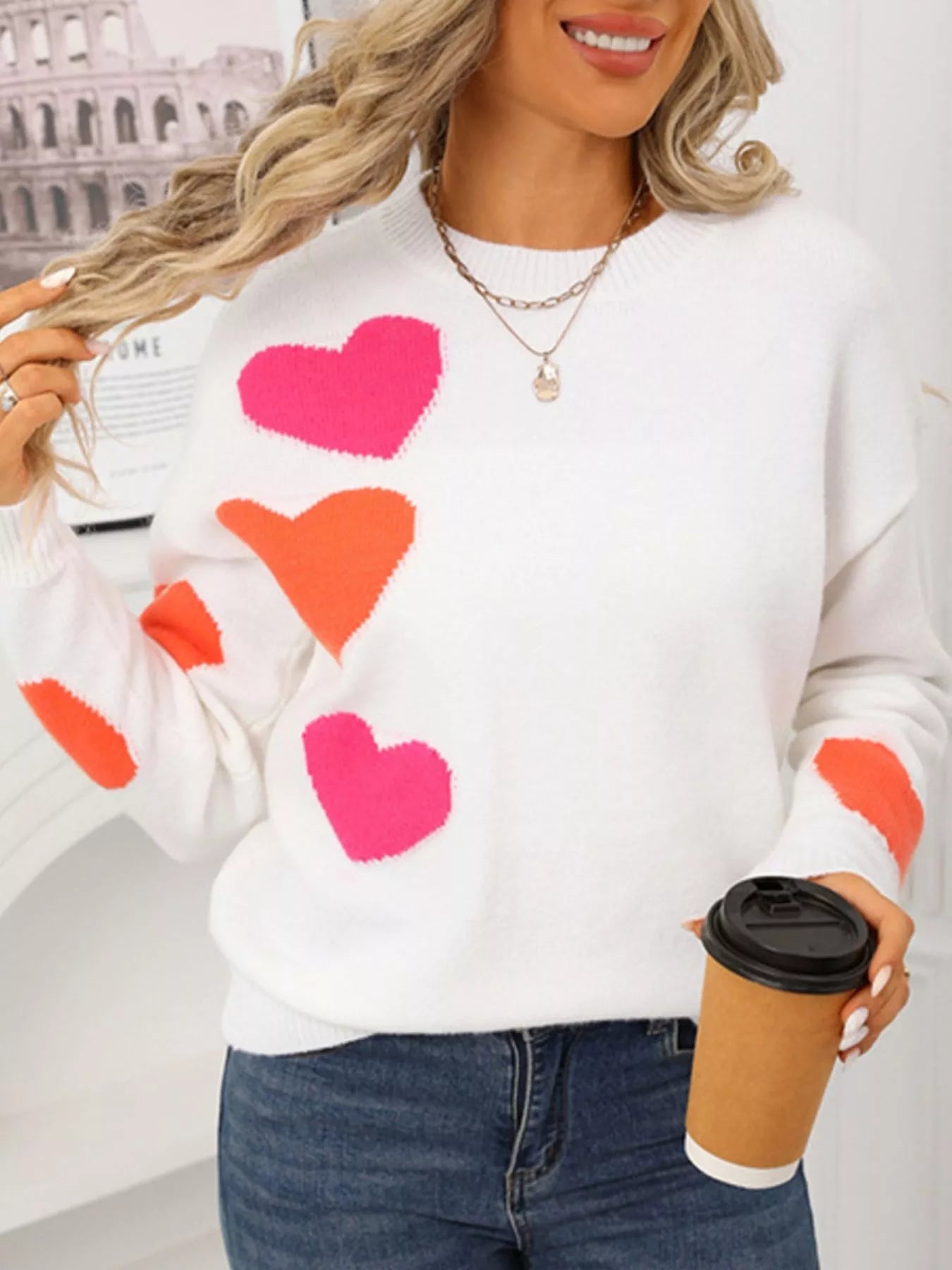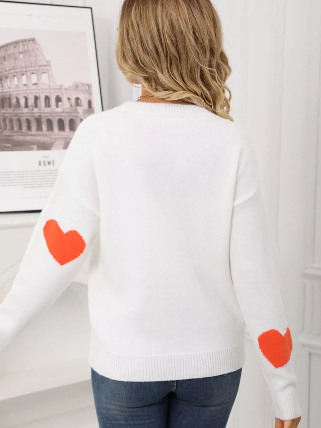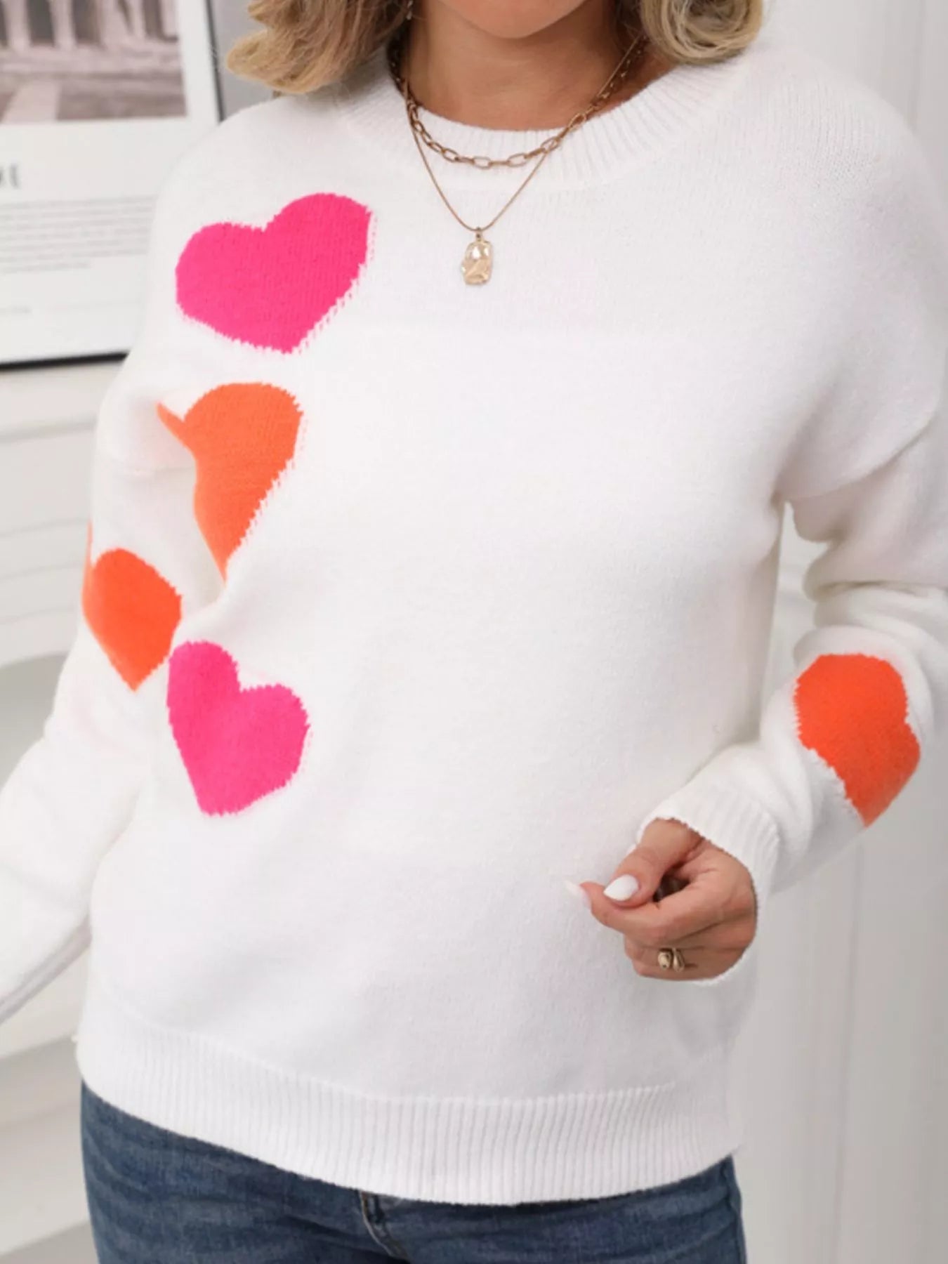Valentine's Day Heart Pattern Round Neck Sweater