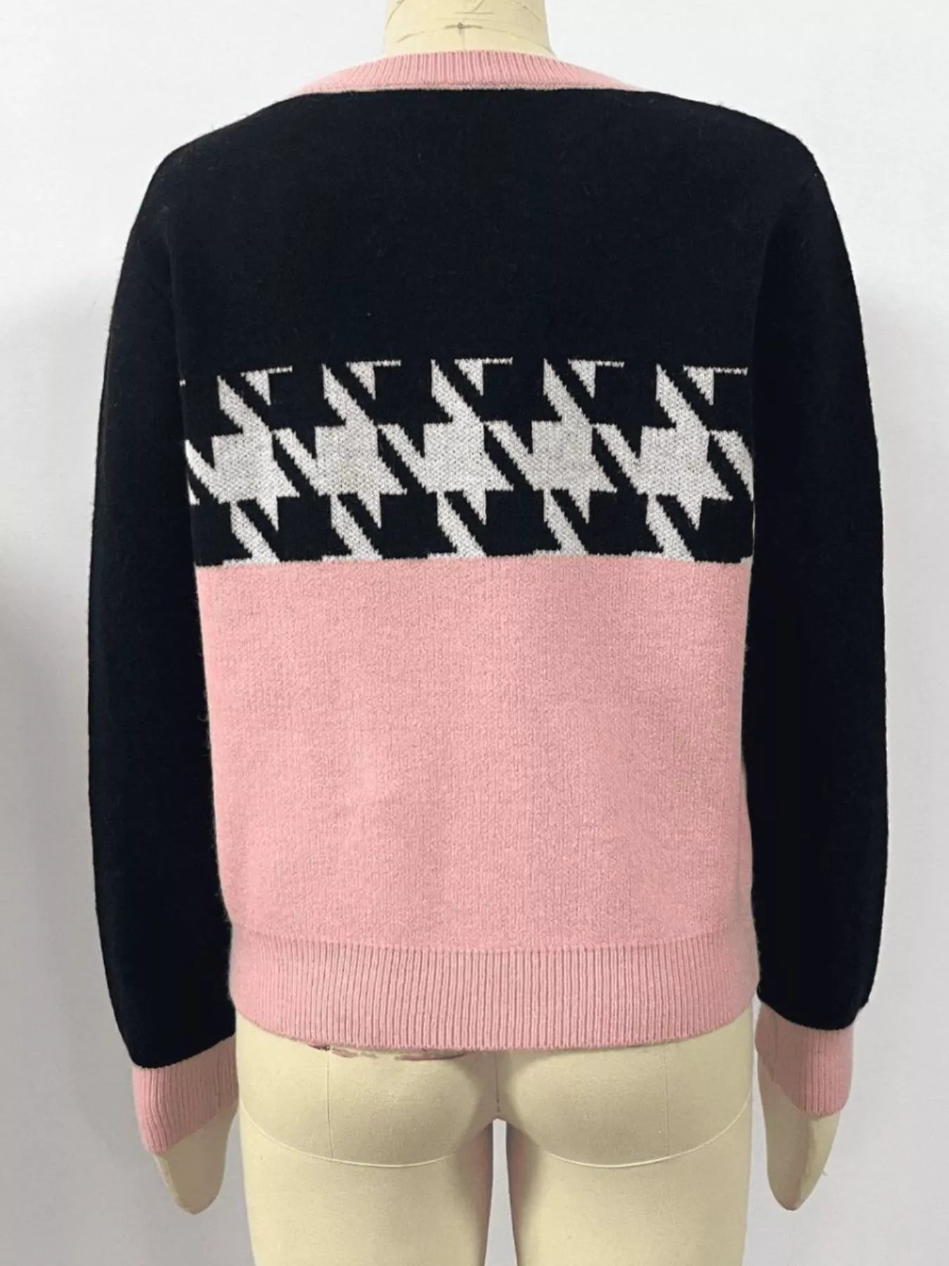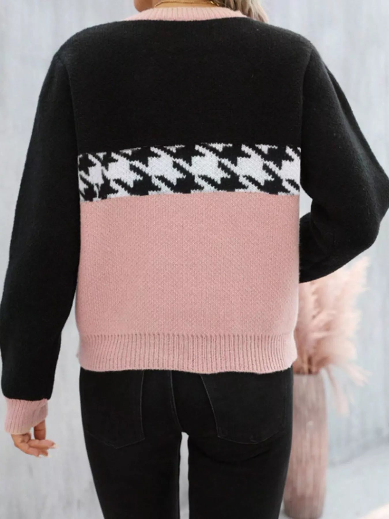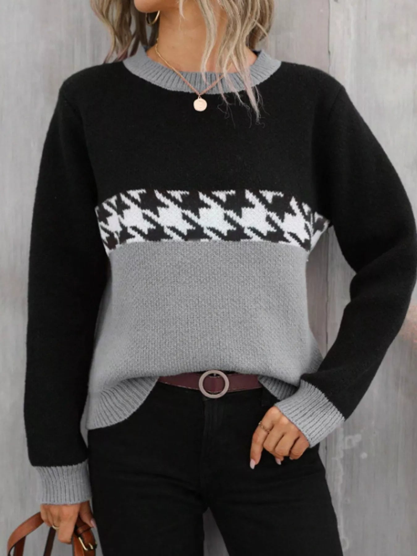 This stylish pullover sweater features a fashion color block design with a classic houndstooth pattern. The crew neckline and long sleeves provide a comfortable and relaxed fit. Made from soft knit fabric, this sweater is perfect for everyday wear. Its versatile style makes it easy to pair with jeans, skirts, or leggings for a fashionable look. The sweater is a great addition to any wardrobe, offering both comfort and style. The material is a blend of acrylic and polyester, ensuring durability and easy care. Ideal for casual outings or cozy nights in.