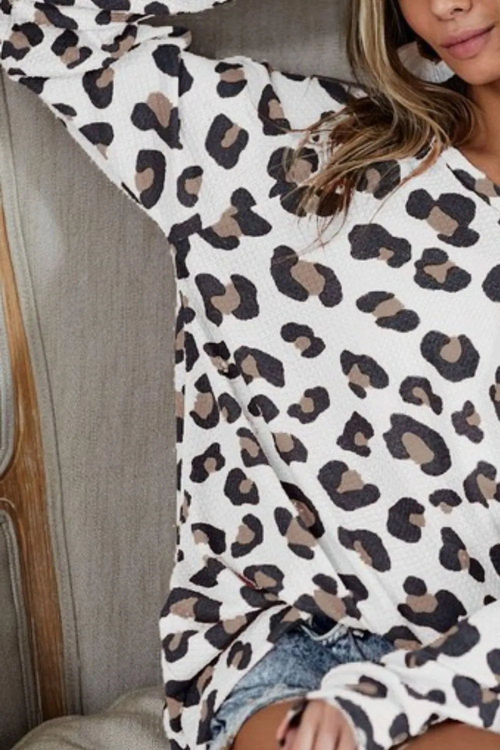 This leopard hacci knit top is a stylish and versatile addition to your wardrobe. The leopard print adds a fun and bold touch to the top, perfect for making a statement. The hacci knit fabric is soft and comfortable, making it ideal for all-day wear. Pair this top with jeans or a skirt for a trendy and fashionable look. Stay on-trend with this chic leopard hacci knit top.