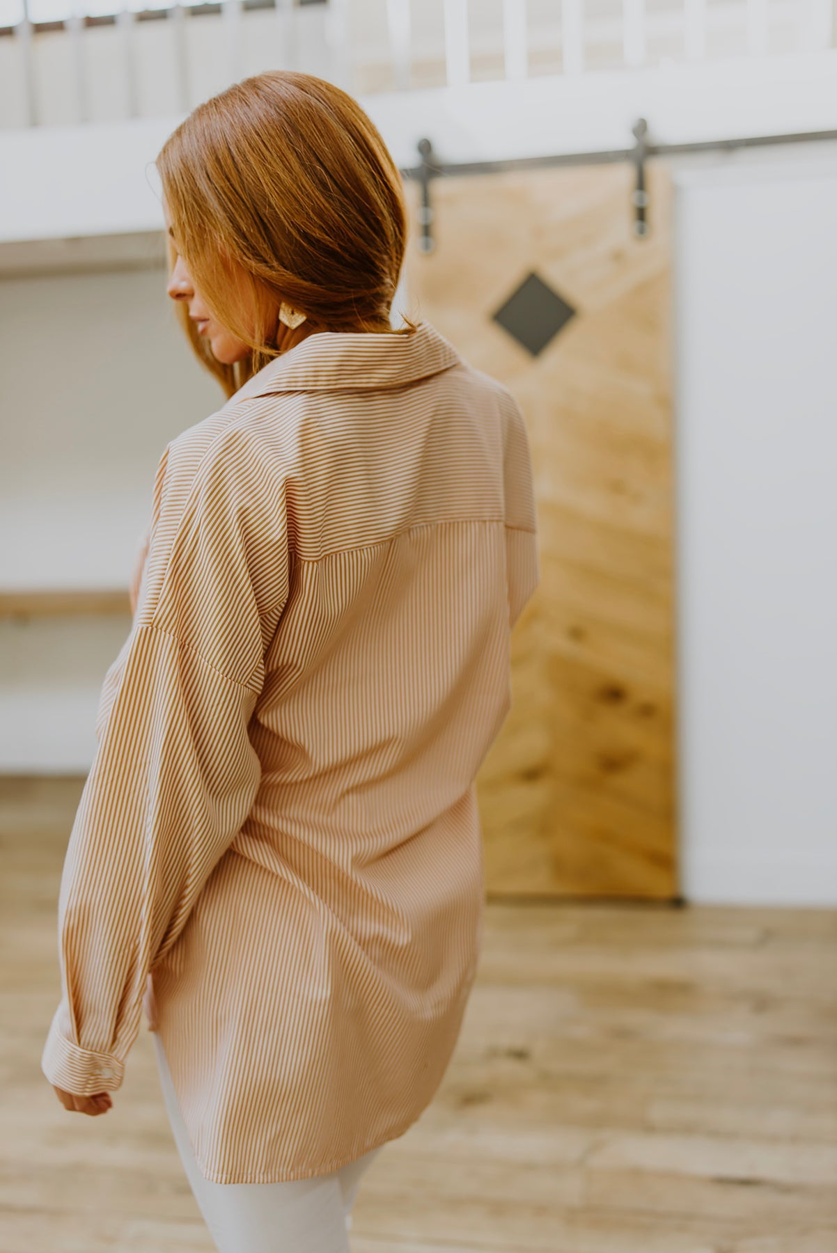 Step up your style game with the Easy On The Eyes Striped Button Up, which is also easy on your budget! The oversized fit, combined with the playful peach and white stripes, gives a relaxed yet fashion-forward vibe. The dropped shoulder and fold over collar add a touch of sophistication, while the stepped high/low hem and side slits provide an effortless and comfortable fit.
