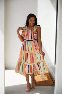 Show off your playful side in the Painted Palette Midi Dress. Featuring a striking square neckline and a multi-hued striped pattern, this stylish tiered dress will add an enchanting flair to any ensemble. Delight in the added flounce of the ruffle detail, bringing all the beauty of a painting to life.