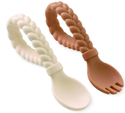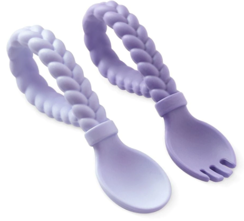 Add some fun fashion to feeding time with These Sweetie Spoons silicone fork and spoon set! Comes in Blue, Purple, and Pink colors with a braided texture to make it easy for little hands to grip and hold.